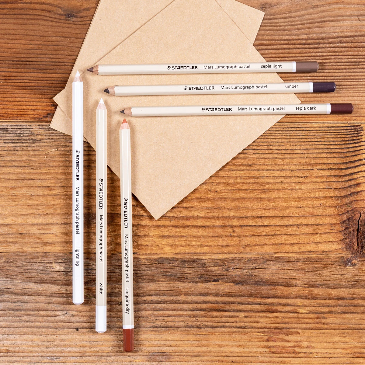 Ces crayons sont particulièrement adaptés aux croquis expressifs et aux portraits, lorsque vous voulez construire progressivement les ombres et les volumes. Ils conviennent aussi très bien aux hachures et à l’estompe, pour obtenir des transitions douces sans contours durs. Utilisez les couleurs seules pour des études rapides, ou en complément de votre assortiment de crayons lorsque vous avez besoin de teintes classiques sepia et umber. Ce set convient autant aux débutants qui veulent découvrir l’effet pastel qu’aux plus expérimentés à la recherche d’un kit compact à emporter.