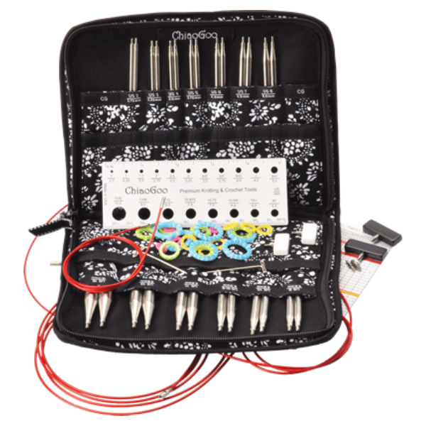 Ce set complet d’aiguilles circulaires de ChiaoGoo est destiné aux tricoteurs exigeants en quête de précision, de qualité et de flexibilité. Il contient des pointes en acier inoxydable chirurgical et des câbles sans mémoire de forme – le tout dans un étui compact et pratique.