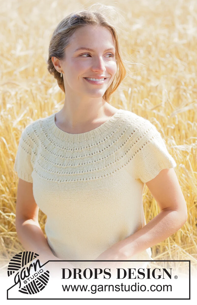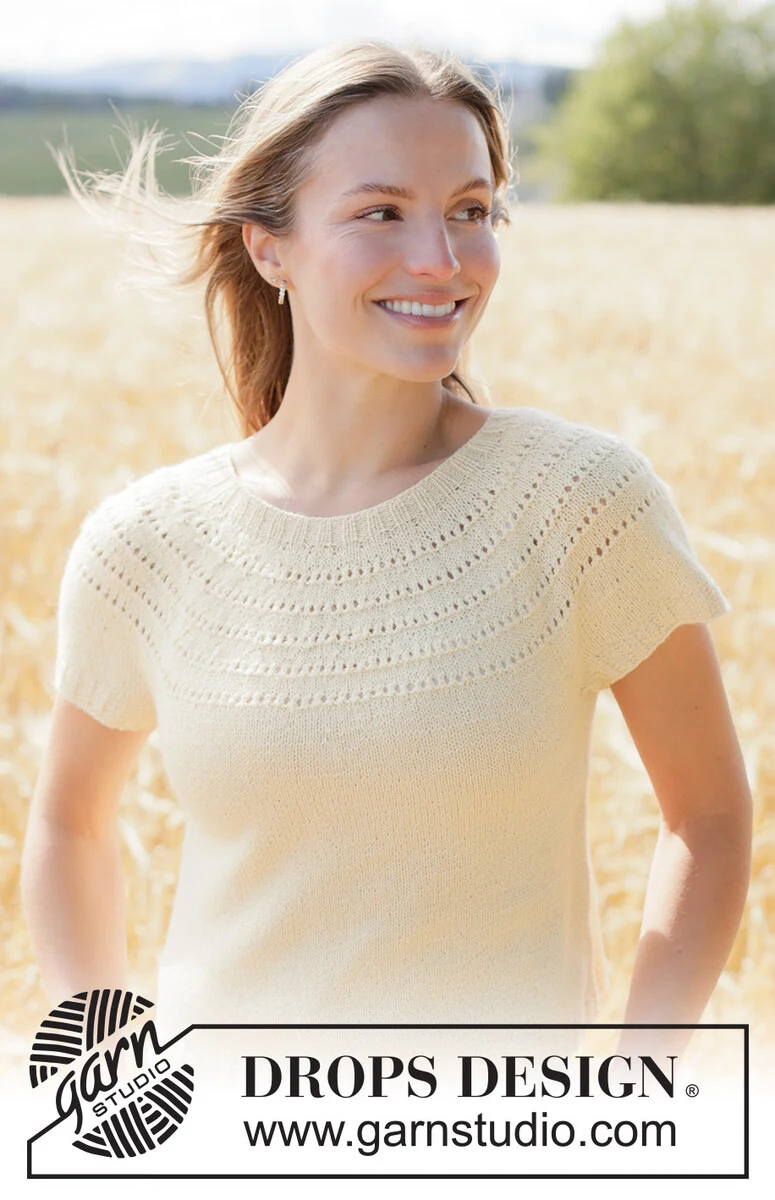 Pull manches courtes tricoté en DROPS Nord. Se tricote de haut en bas avec empiècement arrondi en point ajouré. Du XS au XXXL.