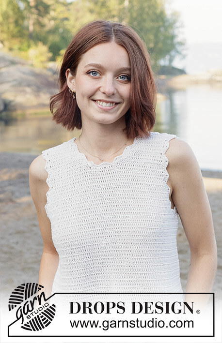 Top crocheté de haut en bas en DROPS Safran. Se crochète en brides avec bordures au point d’éventail. Du S au XXXL.