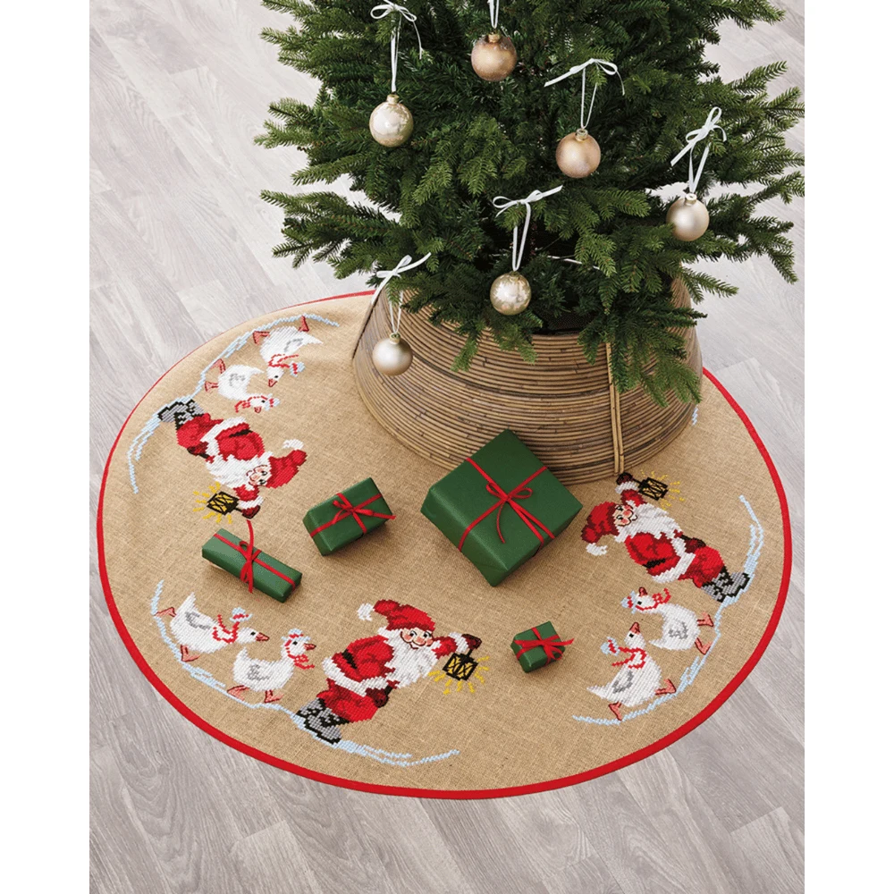 Kit de broderie atmosphérique avec un motif de Noël classique représentant le Père Noël et des oies. Le kit se brode au point de croix et au point arrière sur une toile de jute robuste.