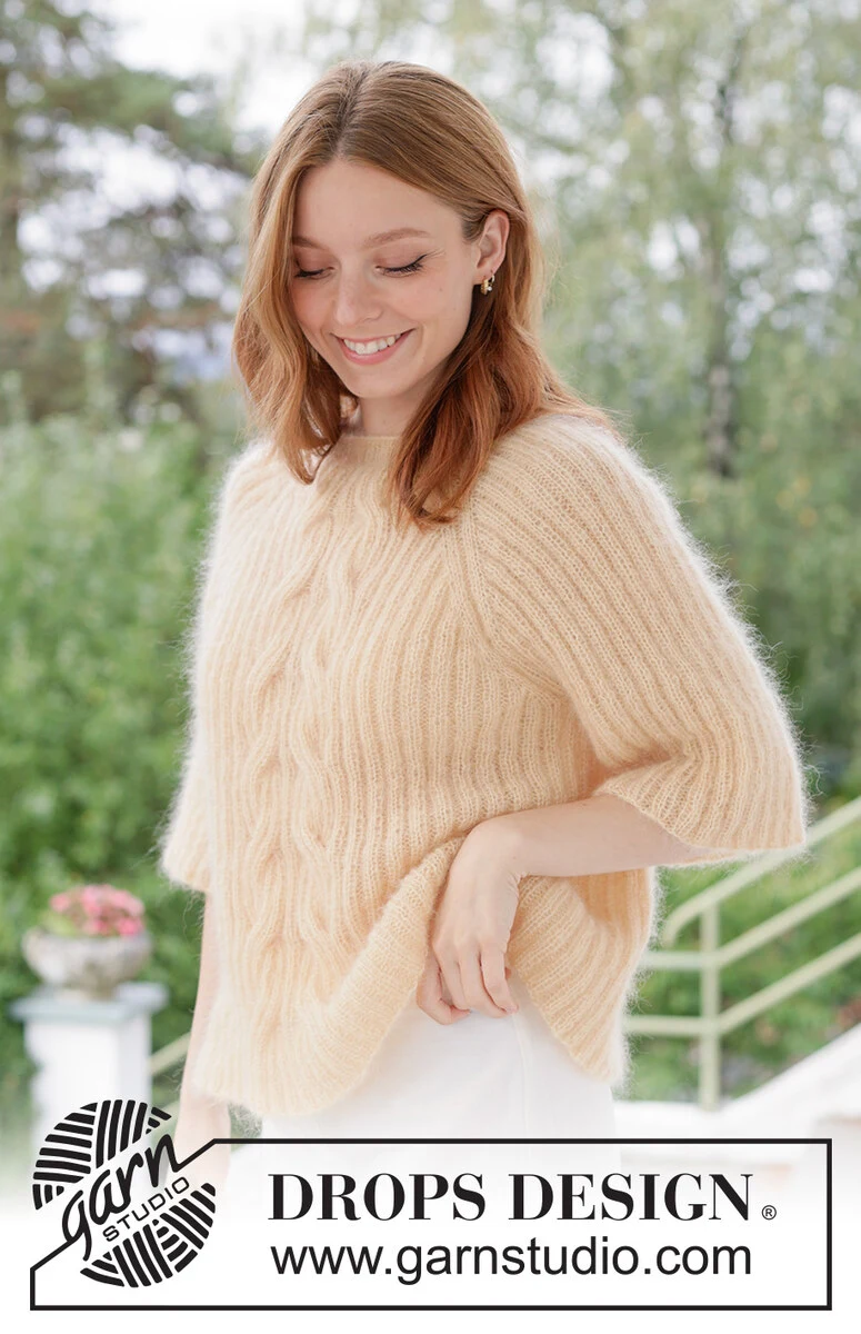 Pull tricoté avec 2 fils DROPS Kid-Silk. Se tricote de haut en bas avec emmanchures raglan, torsades et côtes. Du XS au XXXL.
