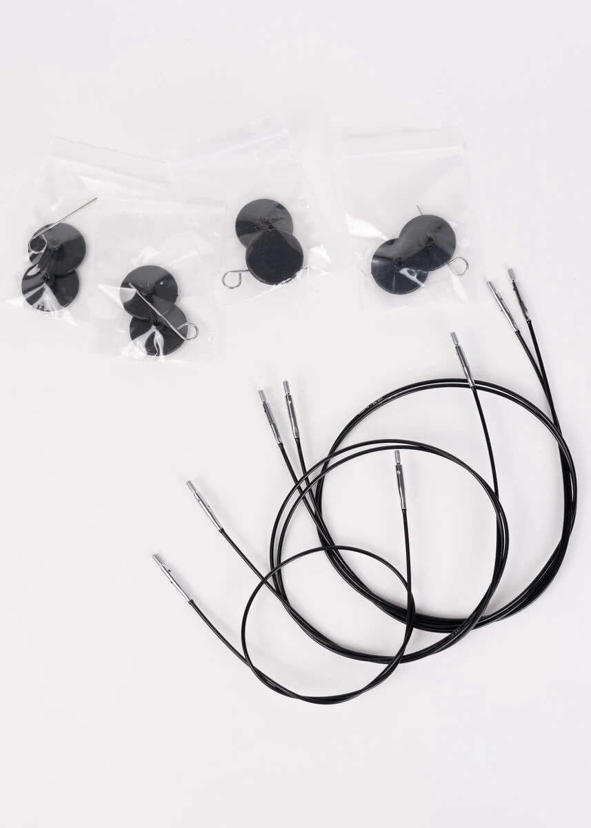 Contient : 8 pointes d’aiguilles en tailles 3.50, 4.00, 4.50, 5.00, 5.50, 6.00, 7.00 et 8.00 mm, ainsi que 4 câbles 60, 80 (2 pcs) et 100 cm avec clés pour câble, embouts et mode d’emploi.
